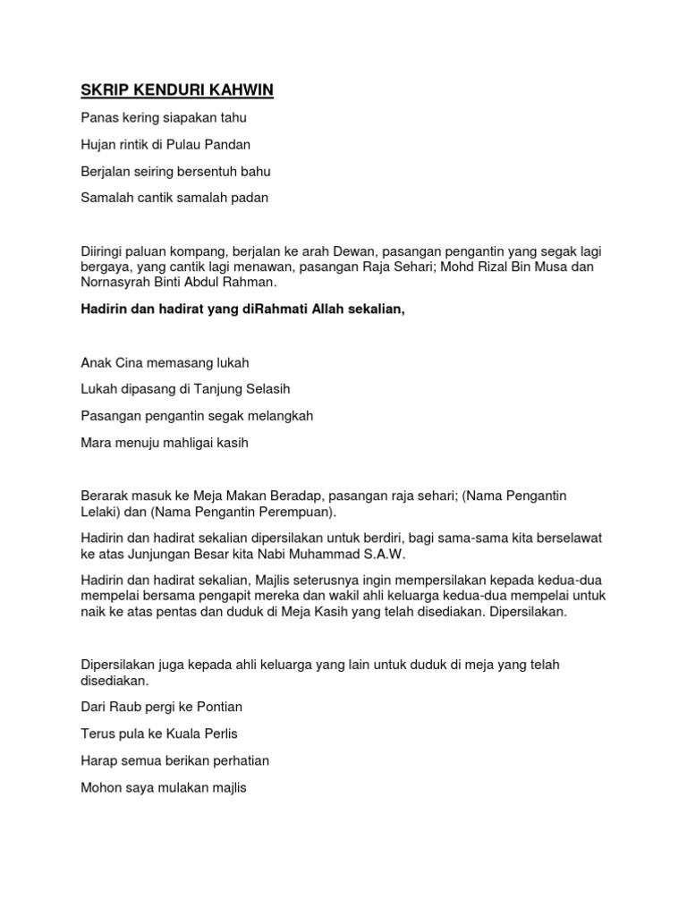 Teks Pengacara Majlis Perkahwinan from imgv2-2-f.scribdassets.com Membawakan dari auditorium seri perdana ,pertandingan pidato peringkat daerah jasin melaka bandaraya bersejarah. Apabila diumumkan ketibaan para tetamu jemputan. Bismillahirrahmanirrahim ,assalamualaikum warahmatullahi wabarakatuh dan salam sejahtera. Gambar di atas adalah hiasan semata mata. Contoh teks terbaik dan lengkap dari mula program sehingga akhir penutup. Contoh teks pengacara majlis emcee by emcee kahwin 01162099363 8:39 pg 0 comments deejay emcee kahwin karaoke pa system wedding. Koleksi teks pengacara majlis hari anugerah kecemerlangan. Teks pengacara majlis persaraan anneza hussein.